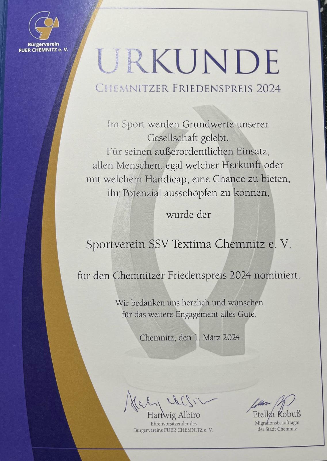 SSV Textima nominiert für den Chemnitzer Friedenspreis 2024